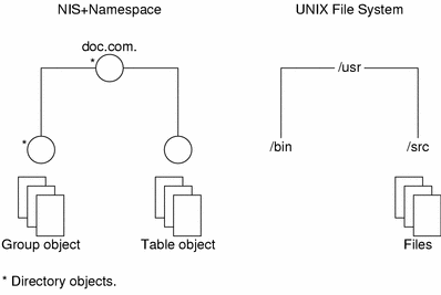 Although the arrangement of an NIS+ namespace can vary from site to site, all sites use the same structural components: directories, tables, and groups. These components are called NIS+ objects. NIS+ objects can be arranged into a hierarchy that resembles a UNIX file system. For example, the illustration below shows, on the left, a namespace that consists of three directory objects, three group objects, and three table objects; on the right it shows a UNIX file system that consists of three directories and three files: