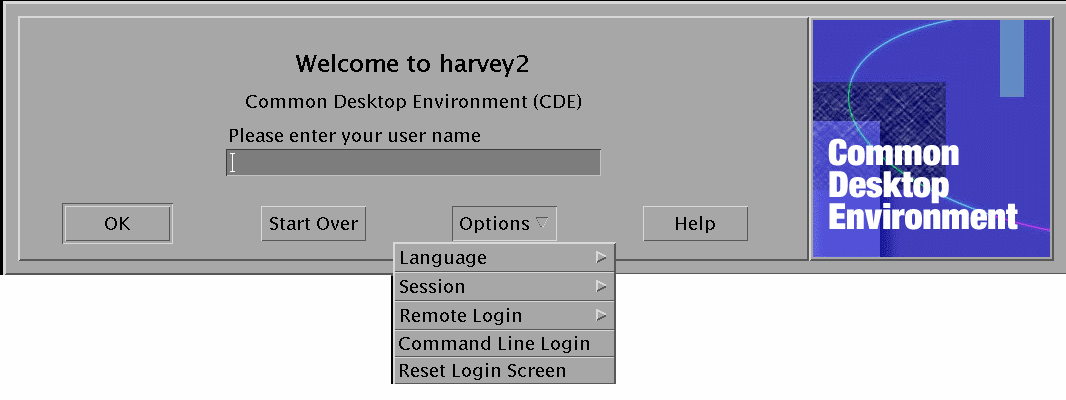 Choose Command Line Login from the Options menu on the Solaris CDE login screen. After the screen clears, press Return to display a login prompt.
