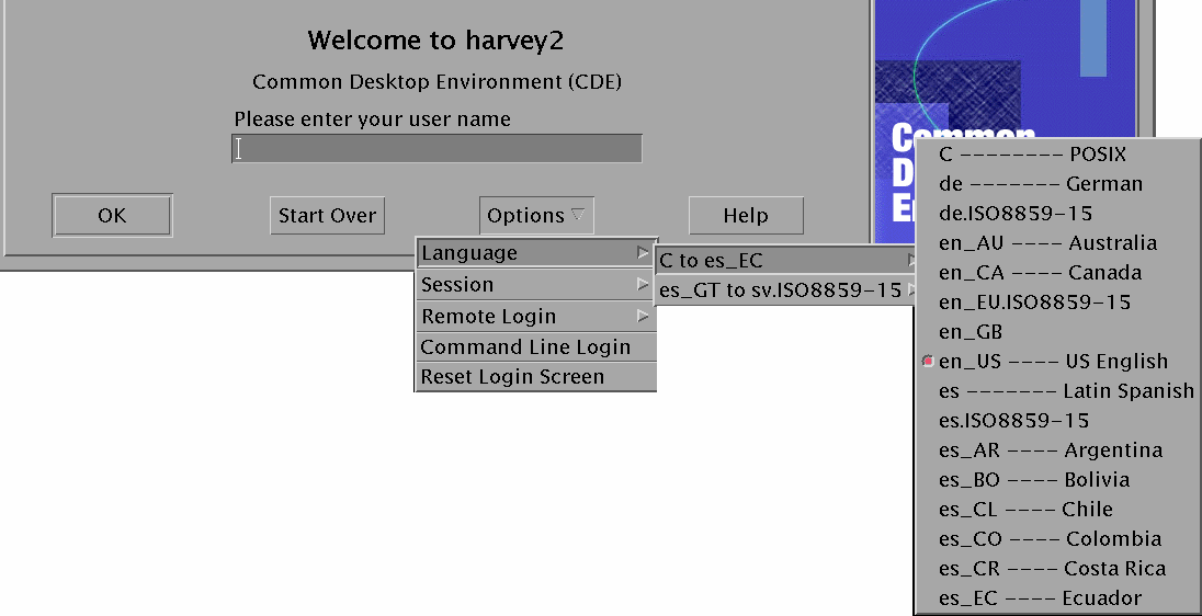 You select the preferred language when you log in to Solaris CDE. The following Solaris CDE login screen shows the Language choice on the Options menu.