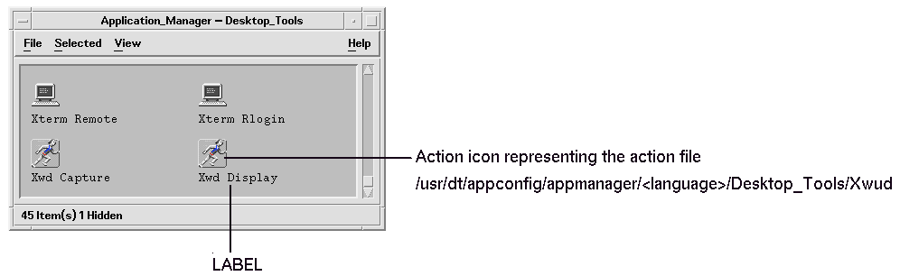Note - The action file is not the same as the action definition file. The action file is a file with the same name as the action. It is used to create the application icon in File Manager or Application Manager. The action definition file is the file named name.dt containing the definition of the action.