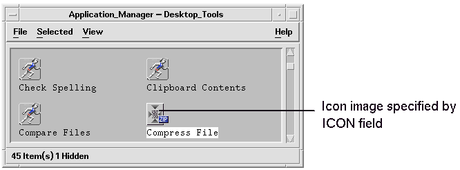 In contrast, the icon labeled Compress File uses a different icon image because its underlying action definition contains an ICON field: