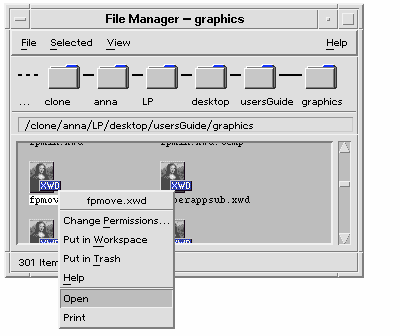 Another common use for actions is in menus. Data files usually have actions in their Selected menu in File Manager. For example, XWD files (files with names ending in.xwd or.wd) have an Open action that displays the screen image by running the Xwud action.
