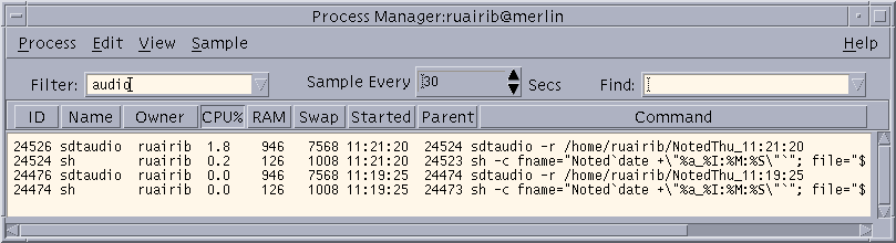 Figure 19-1 Process Manager showing process entries containing the string "audio".