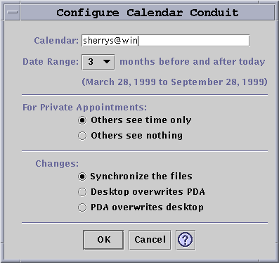 The Configure Calendar Conduit window enables you to determine how appointments are synchronized between calendar applications. Refer to the following figure.