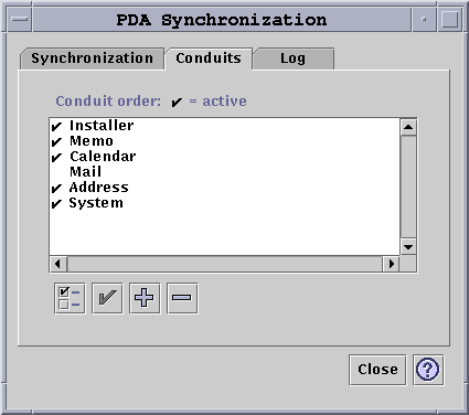 "Add New Conduit to List" (a plus (+) symbol) - Brings up a file selection dialog enabling you to add new conduits. (See the Adding a Conduit section.)