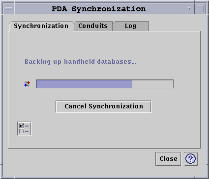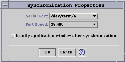 The application begins a synchronization operation using current or default configurations on the currently active or default conduits, as defined on the Conduits tab. The first thing you must do when the Synchronization window appears is establish the port setting in the Synchronization Properties window.