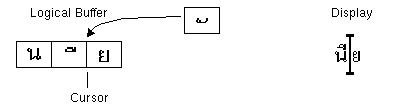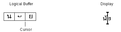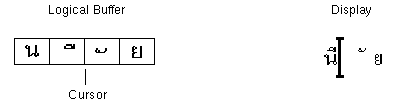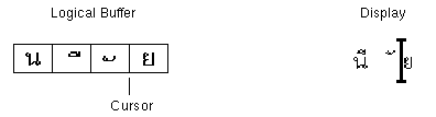 Cursor movement in a Terminal window is slightly different from editing text in one of the Thai CDE tools using text widgets (such as dtpad). When you move the cursor in a Terminal window, if there is only one character in a display cell, the cursor will be highlighted in the cell. If the character shares a display cell, the entire display cell will be highlighted.