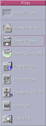 ![]() | Open Floppy | Loads a diskette in drive and displays File Manager view of it. | None |
