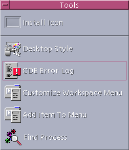 ![]() | CDE Error Log | Displays the file $HOME/.dt/errolog which contains CDE errors after xsession startup | None |