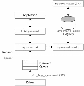 Device drivers use the ddi_log_sysevent(9F) interface to generate and log an event with the system; an event tells the system what has just occurred to the device. The system, in turn, queues events and passes them to the syseventd() daemon outside of kernel process space. syseventd() then passes the events on to an appropriate event-handling process, as shown in Figure 4-1.