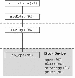 Associated with each device driver is a dev_ops(9S) structure, which in turn refers to a cb_ops(9S) structure. See Chapter 5, Driver Autoconfiguration, for details regarding driver data structures.