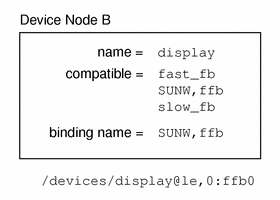 For the device node with the generic device name display, the driver binding name SUNW,ffb is the first name on the compatible property driver list that matches a driver on the system driver list. In this case, display is a generic device name for frame buffers.