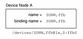 Figure 1-4 and Figure 1-5 show two device nodes: one node uses a specific device name and the other uses a generic device name. For the device node with a specific device name, the driver binding name SUNW,ffb is the same name as the device node name.