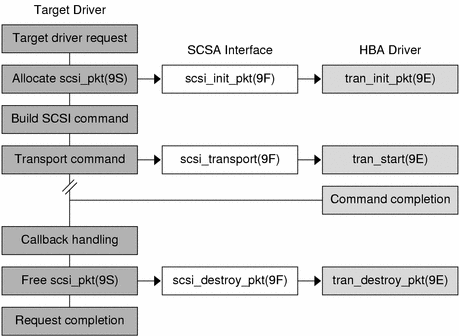 The HBA transport layer is a software and hardware layer responsible for transporting a SCSI command to a SCSI target device. The HBA driver provides resource allocation, DMA management, and transport services in response to requests made by SCSI target drivers through SCSA. The host adapter driver also manages the host adapter hardware and the SCSI protocols necessary to perform the commands. When a command has been completed, the HBA driver calls the target driver's SCSI pkt command completion routine.