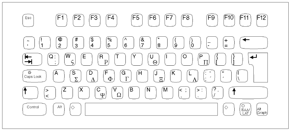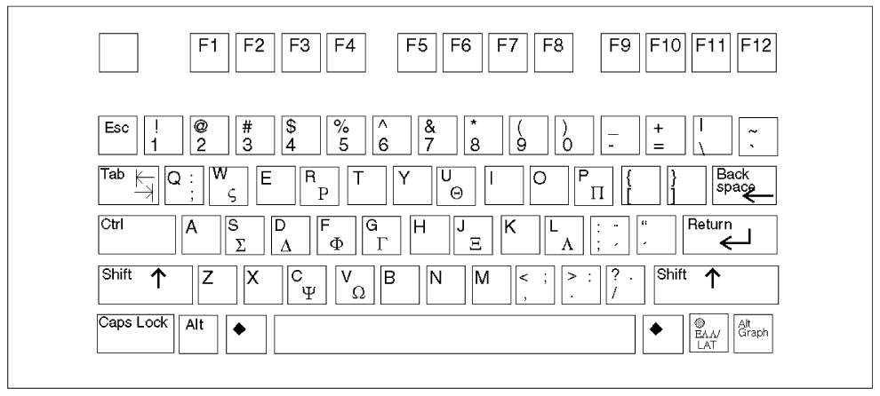 After you switch to Greek input mode, you cannot enter English or European text. To switch back to the English/European input mode, type Control and spacebar together, or select English/European input mode from the Input Mode Selection Window by clicking in the status area. The Greek Euro keyboard layout appears in the following figure.