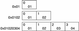 A file's data encoding specifies how to interpret the basic objects in a file. Class ELFCLASS32 files use objects that occupy 1, 2, and 4 bytes. Class ELFCLASS64 files use objects that occupy 1, 2, 4, and 8 bytes. Under the defined encodings, objects are represented as shown below. Byte numbers appear in the upper left corners.