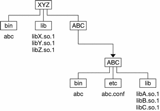For example, the unbundled product XYZ might have dependencies on the product ABC. This dependency can be established by a host package installation script that generates a symbolic link to the installation point of the ABC product, as shown in the following figure.