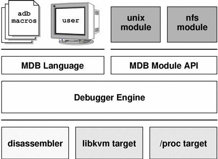 The benefit of MDB's modular architecture extends beyond the ability to load a shared library containing additional debugger commands. The MDB architecture defines clear interface boundaries between each of the layers shown in Figure 2-1. Macro files execute commands written in the MDB or adb language. Dcmds and walkers in debugger modules are written using the MDB Module API, and this forms the basis of an application binary interface that allows the debugger and its modules to evolve independently.
