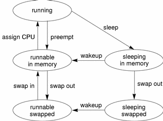 Applications that have strict real-time constraints might need to prevent processes from being swapped or paged out to secondary memory. A simplified overview of UNIX process states and the transitions between states is shown in the following figure.