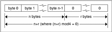 This appendix uses graphic box notation for illustration and comparison. In most illustrations, each box depicts a byte. The representation of all items requires a multiple of 4 bytes (or 32 bits) of data. The bytes are numbered 0 through n -1. The bytes are read or written to some byte stream such that byte m always precedes byte m+1. The n bytes are followed by enough (0 to 3) residual zero bytes, r, to make the total byte count a multiple of four. Ellipses (...) between boxes show zero or more additional bytes where required, as shown in the following illustration.