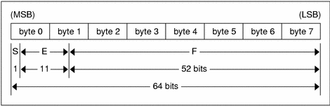Just as the most and least significant bytes of an integer are 0 and 3, the most-significant and least-significant bits of a double-precision floating-point number are 0 and 63. The beginning bit, and most significant bit, offsets of S, E, and F are 0, 1, and 12 respectively.