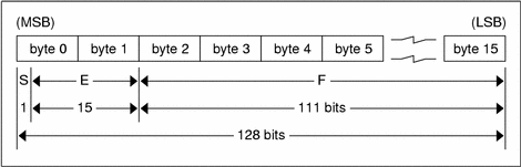 Just as the most-significant and least-significant bytes of an integer are 0 and 3, the most-significant and least-significant bits of a quadruple-precision floating- point number are 0 and 127. The beginning bit, and most-significant bit, offsets of S, E, and F are 0, 1, and 16 respectively. These offsets refer to the logical positions of the bits, not to their physical locations, which vary from medium to medium.