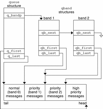 The structure contains pointers to the linked list of messages in the queue. These pointers, qb_first and qb_last, denote the beginning and end of messages for the particular band. The qb_count field is analogous to the queue's q_count field. However, qb_count only applies to the messages in the queue in the band of data flow represented by the corresponding qband structure. In contrast, q_count only contains information regarding normal and high-priority messages.