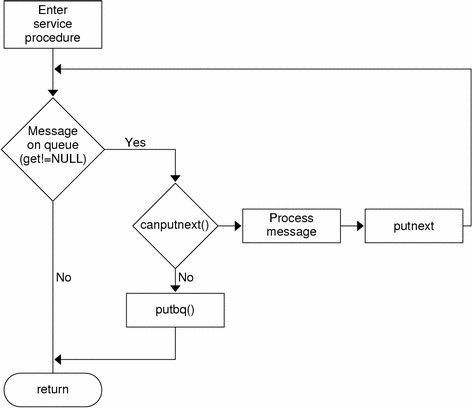 A service procedure usually processes all messages on its queue (getq(9F)) or takes appropriate action to ensure it is re-enabled (qenable(9F)) at a later time. Figure 7-11 shows the flow of a service procedure.