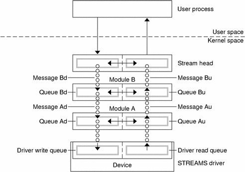 The stream head is created when a user process opens a STREAMS device. It translates the interface calls of the user process into STREAMS messages, which it sends to the stream. The stream head also translates messages originating from the stream into a form that the application can process. The stream head contains a pair of queues; one queue passes messages upstream from the driver, and the other passes messages to the driver. The queues are the pipelines of the stream, passing data between the stream head, modules, and driver.