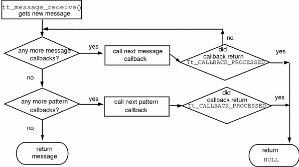 Figure 11-1 illustrates how the ToolTalk service invokes message and pattern callbacks when tt_message_receive is called to retrieve a new message.