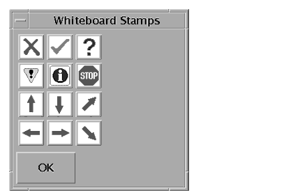 The Whiteboard Stamps window offers a number of images you can "stamp" on the whiteboard. These are user configurable. The SunForum software enables you to use bitmap files (such as GIF) in user-defined locations.