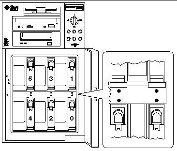 The Sun Enterprise 250 server's internal disk array can accommodate up to six UltraSCSI disk drives. The figure below shows the system's six internal disk slots. Disk slots are numbered from 0 to 5. Select any available slot for the new disk drive.
