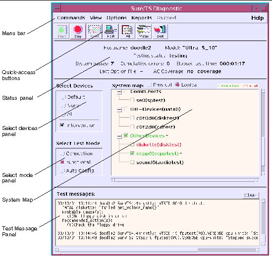 This section describes how to use the fundamental features of the SunVTS CDE UI to perform diagnostic testing on a system. For information about using more advanced features, see Using Additional Features with the SunVTS CDE UI .