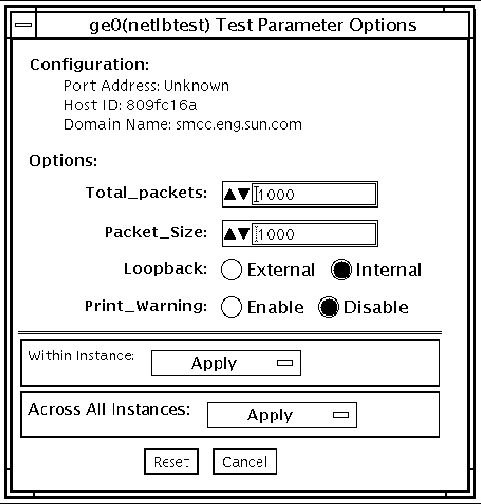 /opt/SUNWvts/bin/netlbtest standard_arguments -o dev= device ,tpkts= n ,pksz= pkt_size ,lb= Internal ,warn= Disable