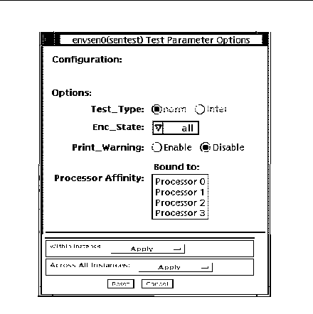 To reach the dialog box below, right-click on the test name in the System Map and select Test Parameter Options. If you do not see this test in the System Map, you might need to expand the collapsed groups, or your system may not include the device appropriate to this test. Refer to the SunVTS User's Guide for more details.