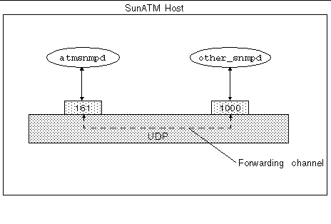 atmsnmpd can be used as a forwarding agent. If you configure it as a forwarding agent, atmsnmpd will forward SNMP requests for unknown MIBs to the port specified with the forward option, -f . This allows a system to have two SNMP agents respond to requests received over the SNMP port. FIGURE 6-1 illustrates the required configuration. To set up this example configuration, atmsnmpd must be started with the parameter -f 1000 and other_snmpd must be started so that it listens on port 1000.