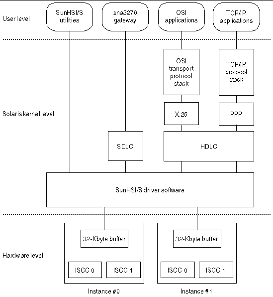 The driver software can also be reached through hardware interrupts from the SunHSI/S hardware. Hardware interrupts, both standard serial control interrupts and on-chip DMA interrupts, are received through the SunHSI/S hardware from the Integrated Serial Communications Controller (ISCC).