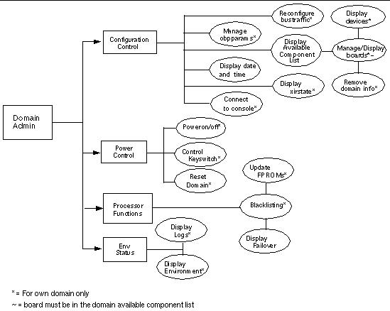 Each domain administrator has access to the Solaris console for that domain and the privilege to exert control over the software that runs in the domain or over the hardware assigned to the domain.