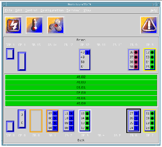 The rest of the main window provides a graphical view of the platform boards and buses. The system boards are named SB0 through SB15, and their processor numbers are shown. The control boards are named CB0 and CB1. The support boards are named CSB0 and CSB1. The buses are named ABUS0 through ABUS3, DBUS0, and DBUS1.
