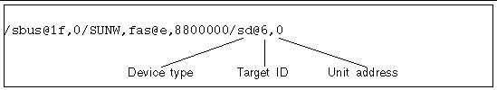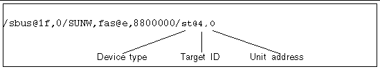 The physical device name is assigned by the system firmware. This name is expressed in the form of a path name. The path name describes the location of the device in relation to the CPU. For SCSI devices, the target ID is part of this address name.