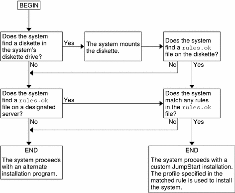After you validate the rules file and the profiles, you can begin a custom JumpStart installation. The JumpStart program reads the rules.ok file. Then, the JumpStart program searches for the first rule with defined system attributes that match the system on which the JumpStart program is attempting to install the Solaris software. If a match occurs, the JumpStart program uses the profile that is specified in the rule to install the Solaris software on the system.