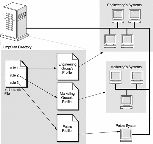 First, the system administrator must create a rules file and a profile for each group of systems. The rules file is a text file that contains a rule for each group of systems or single systems on which you want to install the Solaris software. Each rule distinguishes a group of systems that are based on one or more system attributes. Each rule also links each group to a profile.