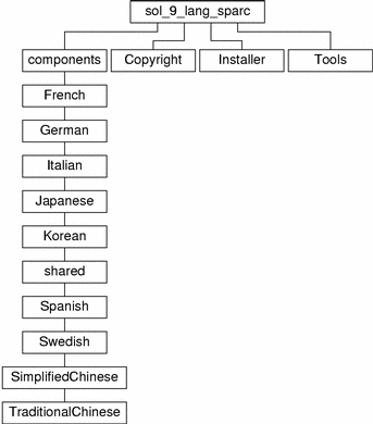 The following figure shows the directory structure of the Solaris 9 Languages CD.