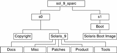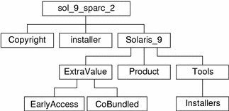 The following figures show the directory structure on the Solaris 9 Software CDs.