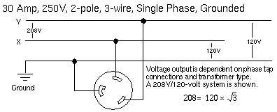 Operating RangeNominal Voltage: 208, 220, 230, or 240 Volts AC AC Power PlugThe 230VAC power plug is a NEMA L6-30P. The 240VAC power plug is a Blue, 32A, IEC 309, with Ground at the 6-hour position. 230V Sequencer AC Power CordA 12 AWG Type SJO flexible cord rated at 25A when connected to utilization equipment with 2 current carrying conductors is used. Refer to Article 400-5 of the US National Electrical Code. NEMA L6-30R / ANSI C73.75 230 Volt Power Receptacle