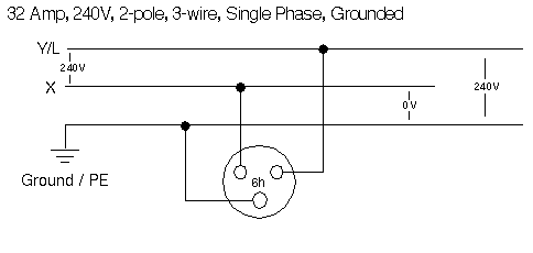 Blue, 32A, IEC 309, with Ground at the 6-hour position.