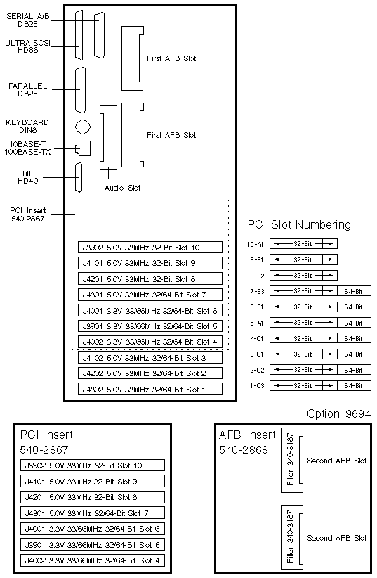 2. 64-Bit PCI boards do not fit into Slots 9 and 10 of system boards 501-5028, 501-2996, and 501-5270. Connectors J3802 and J4707 interfere with the 64-Bit PCI extension connector.