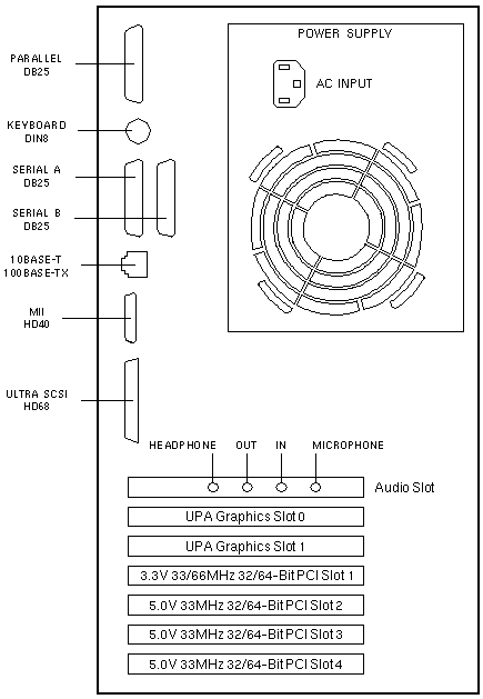 PCI Bus B shares the address/data bus with onboard Audio, Ethernet, Flash, Floppy, Keyboard, Mouse, NVRAM, Parallel, SCSI, and Serial devices.