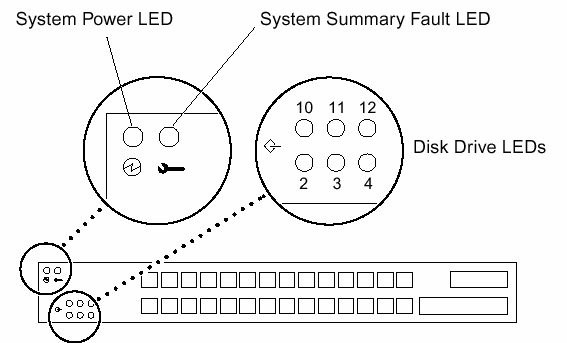 | Disk Drive | Solid green | A disk drive is present in that slot but is not active. The Disk Drive LED also gives the SCSI ID for that disk drive. |