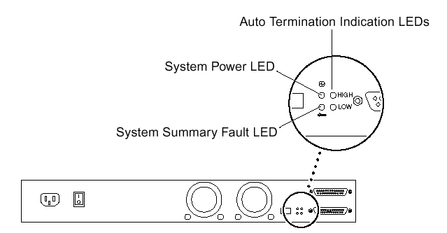 The Auto Termination Indication LEDs indicate if the Netra st D130 storage enclosure is part of an UltraSCSI, wide SCSI, or narrow SCSI daisy-chain. It also indicates its position in the daisy-chain.